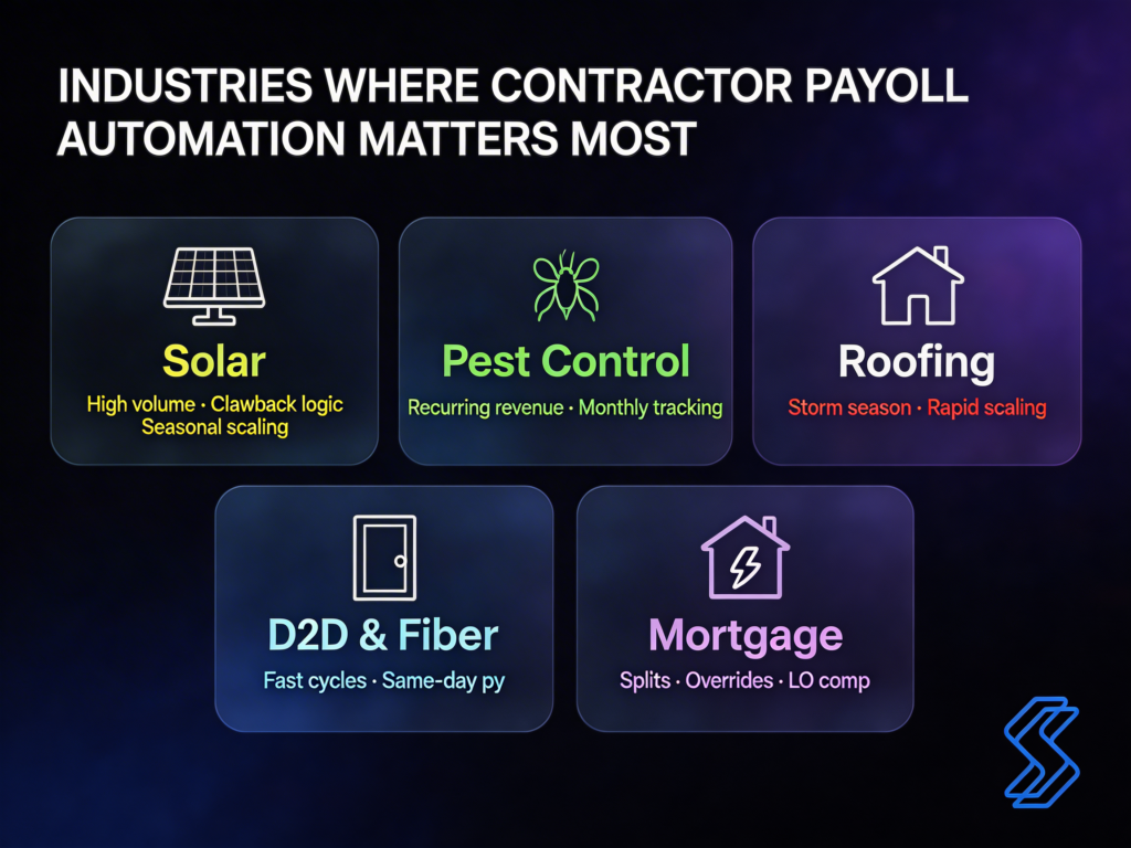 - Solar — high volume, clawback logic, D2D rep turnover, and seasonal scaling make automated commission calculation critical